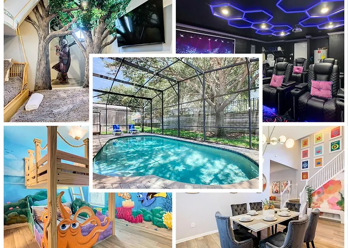 Deze 5-slaapkamer Wh7820Bs - 5 Bedrooms - Pool - Theater - Resort ligt in de Celebration wijk van de stad en beschikt over een buitenzwembad waar gasten kunnen ontspannen.
